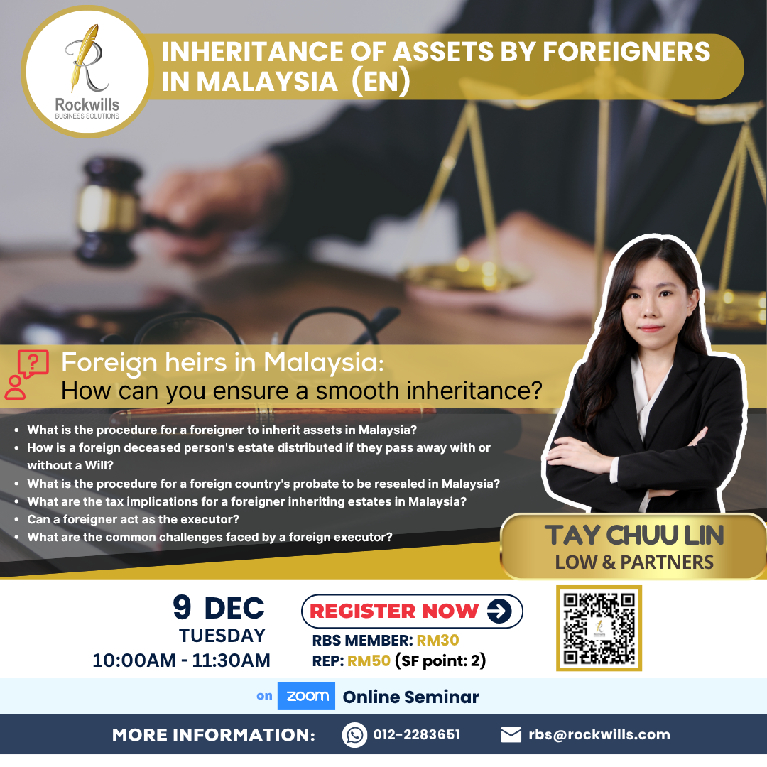 👨🏫 Join our online sharing session with our speaker, Ms. Tay Chuu Lin from Low and Partners to understand more about foreign heirs in Malaysia such as what are the legal, financial, and procedural steps to ensure a smooth inheritance?