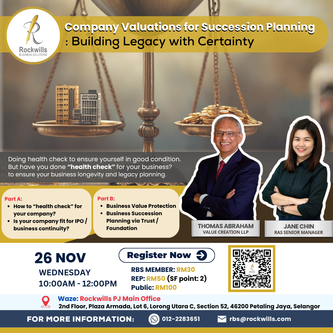 👨‍🏫 Join our physical sharing session with our speaker, Mr. Thomas Abraham from Value Creation LLP and Ms. Jane Chin from Rockwills Advisory Services to understand more about your business’s health and protecting its long-term value.